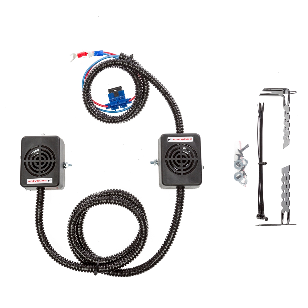 Montaż tego odstraszacza jest niezwykle prosty – wystarczy go zamontować w komorze silnika, skierować głośnik urządzenia w stronę przestrzeni z której kuna dostaję się na silnik oraz podłączyć go pod klemy akumulatora lub wyjścia prądowe.