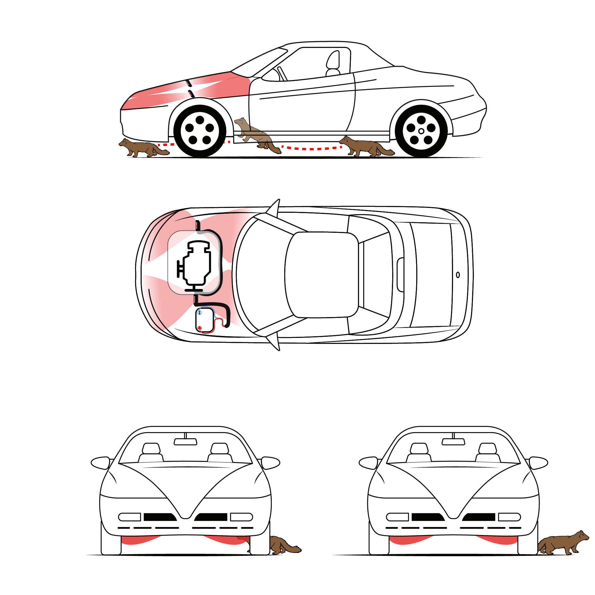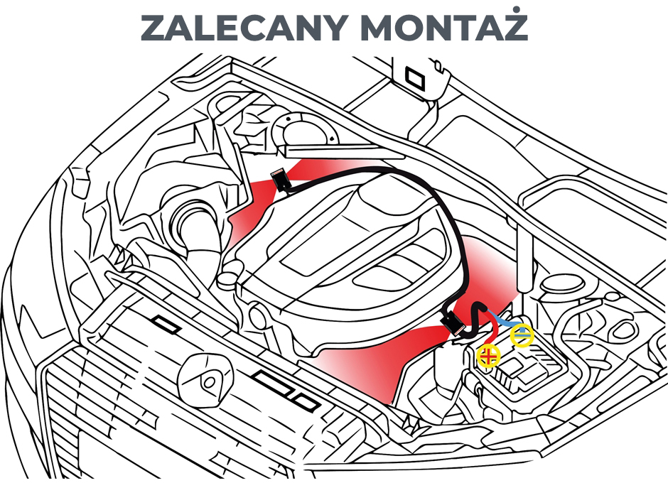 Poniższa grafika przedstawia zalecany i poglądowy sposób montażu oraz działania odstraszacza. Nie jest to dokładny schemat dla każdej komory silnika – każda z nich jest indywidualna i może wymagać innego umiejscowienia urządzenia. W przypadku wątpliwości prosimy o przesłanie zdjęcia komory silnika – doradzimy, gdzie najlepiej zamontować odstraszacz.