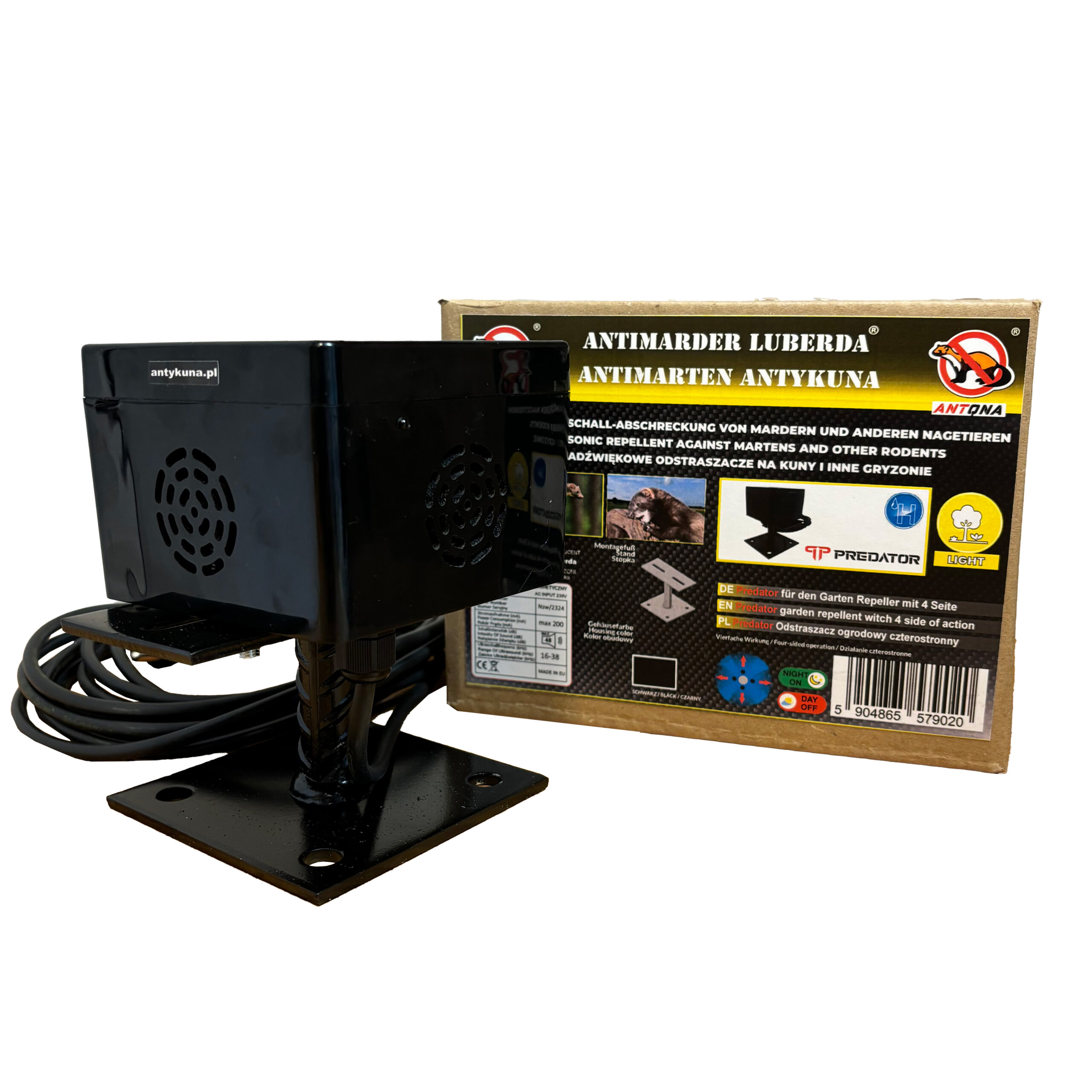 Nasz odstraszacz kun to urządzenie, które działa aż na 4 strony. Wyposażony w stopkę do łatwego montażu, jest wodoszczelny i dedykowany do otwartej przestrzeni. Główną cechą modelu LIGHT PREDATOR jest to, że jest cichy i działa tylko w nocy – praktycznie niesłyszalny dla ludzkiego ucha.