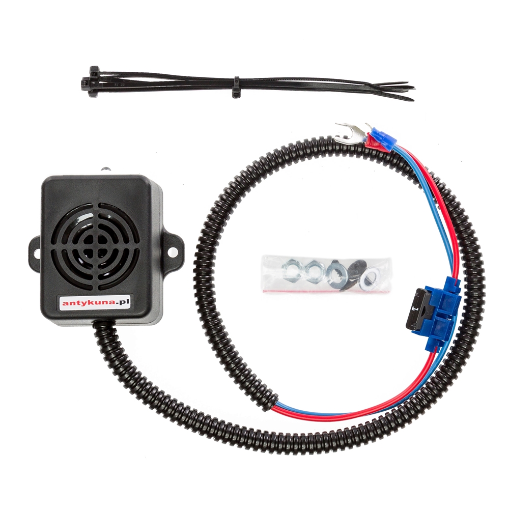 Montaż tego odstraszacza jest niezwykle prosty – wystarczy go zamontować w komorze silnika, skierować głośnik w stronę przestrzeni z której kuna dostaję się na silnik oraz podłączyć go pod klemy akumulatora lub wyjścia prądowe.