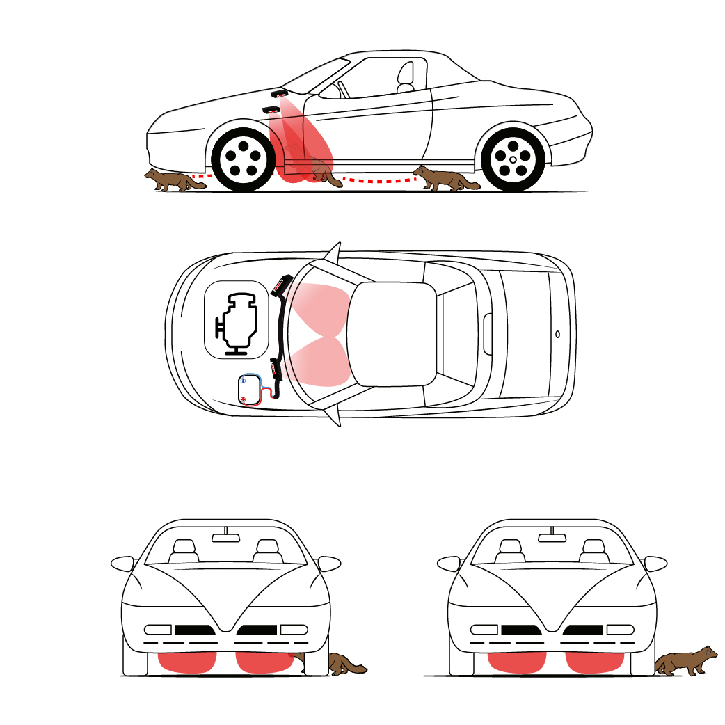 Poniższa grafika przedstawia zalecany i poglądowy sposób montażu oraz działania odstraszacza. Nie jest to dokładny schemat dla każdej komory silnika – każda z nich jest indywidualna i może wymagać innego umiejscowienia urządzenia. W przypadku wątpliwości prosimy o przesłanie zdjęcia komory silnika – doradzimy, gdzie najlepiej zamontować odstraszacz.