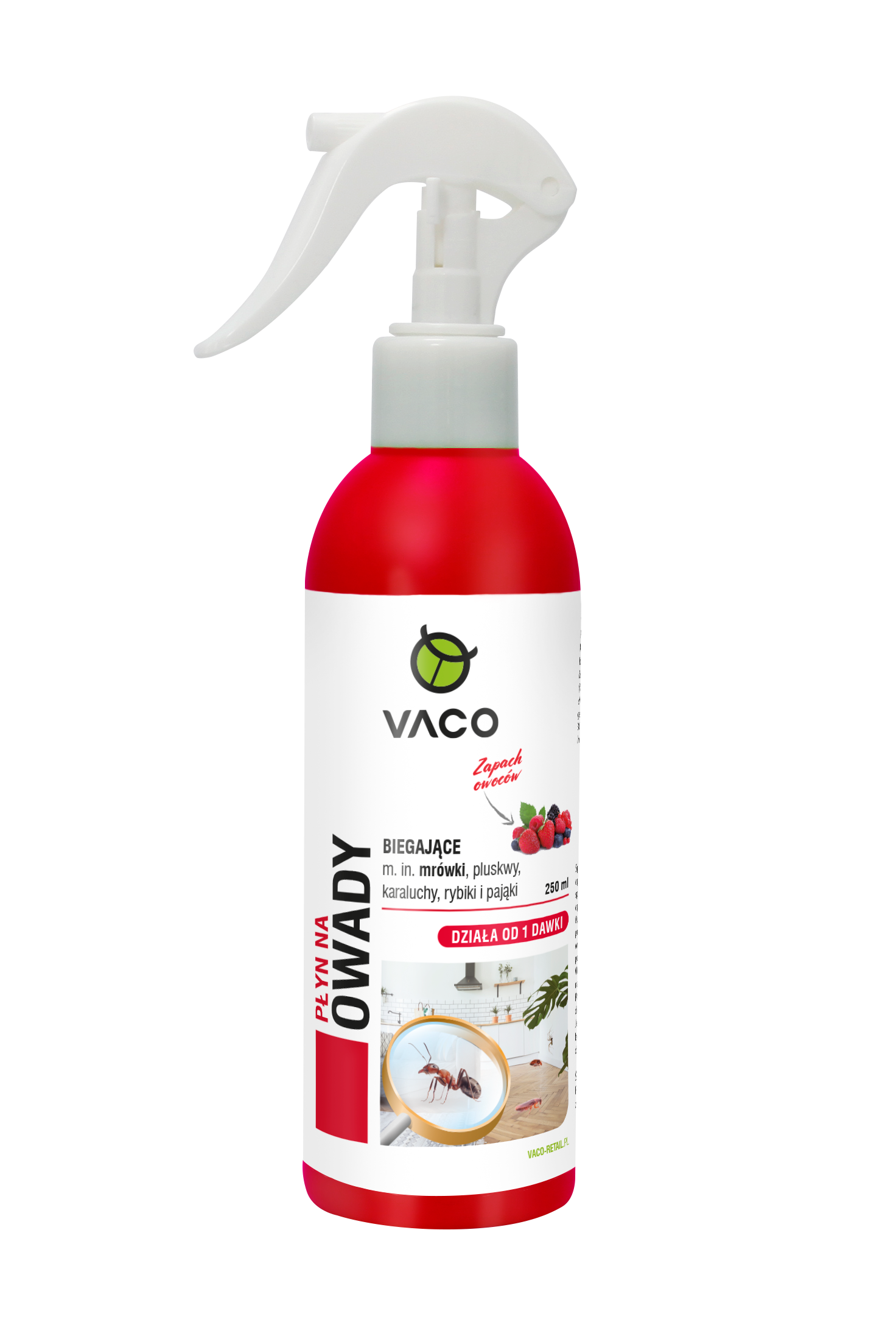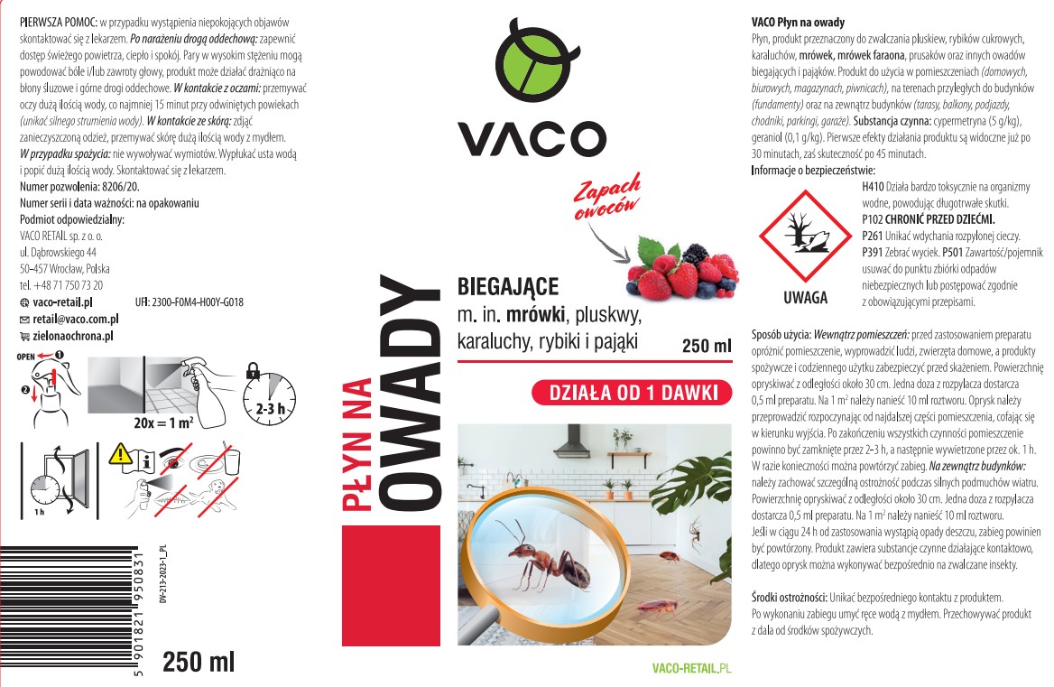 Płyn na mrówki charakteryzuje się szerokim spektrum działania w eliminacji wszystkich rodzajów mrówek, w tym mrówek faraona. Działa już od pierwszej dawki, zwalczając każdą formę rozwojową tych owadów. Posiada poręczne opakowanie z wygodnym atomizerem. Produkt wyróżnia się przyjemnym, owocowym zapachem. Może być używany zarówno wewnątrz, jak i na zewnątrz pomieszczeń. Sposób użycia: Wewnątrz pomieszczeń: przed zastosowaniem produktu opróżnić pomieszczenie, wyprowadzić ludzi, zwierzęta domowe, a produkty spożywcze i codziennego użytku zabezpieczyć przed skażeniem. Powierzchnię opryskiwać z odległości około 30 cm. Jedna doza z rozpylacza dostarcza 0,5 ml preparatu. Na 1m2 należy nanieść 10 ml roztworu. Oprysk należy przeprowadzić rozpoczynając od najdalszej części pomieszczenia, cofając się w kierunku wyjścia. Po zakończeniu wszystkich czynności pomieszczenie powinno być zamknięte przez 2-3h, a następnie wywietrzone przez ok. 1h. W razie konieczności można powtórzyć zabieg. Na zewnątrz budynków: należy zachować szczególną ostrożność podczas silnych podmuchów wiatru. Powierzchnię opryskiwać z odległości około 30 cm. Jedna doza z rozpylacza dostarcza 0,5 ml preparatu. Na 1 m² należy nanieść 10 ml roztworu. Jeśli w ciągu 24h od zastosowania wystąpią opady deszczu, zabieg powinien być powtórzony. Produkt zawiera substancje czynne działające kontaktowo, dlatego zabieg można wykonać bezpośrednio na zwalczane insekty. Środki ostrożności: Unikać bezpośredniego kontaktu z produktem. Po wykonaniu zabiegu umyć ręce wodą z mydłem. Przechowywać produkt z dala od środków spożywczych.