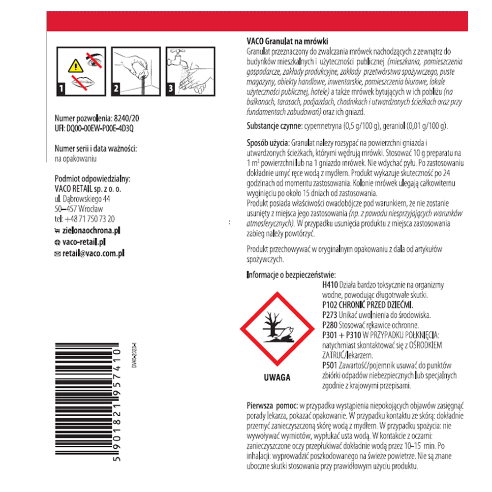 - Jako proszek do posypywania: Proszek należy wysypać na powierzchnię gniazda i na ścieżki, którymi wędrują mrówki.