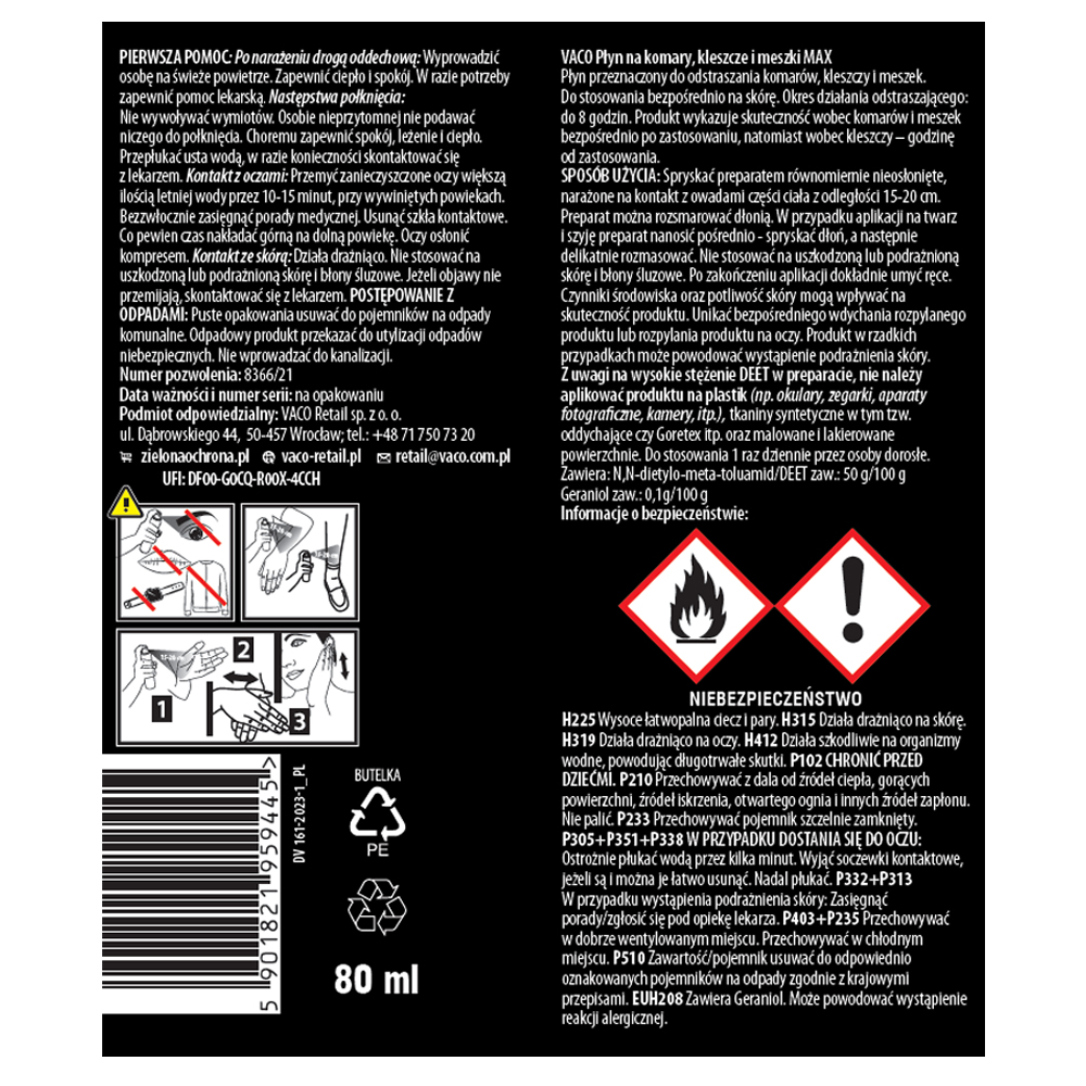 Płyn na komary, kleszcze i meszki to skuteczna ochrona przed ukąszeniami owadów. Zawiera skuteczne substancje: DEET o wysokim stężeniu 50% i geraniol, zapewniające długotrwałą ochronę do 8h. Posiada przyjemny zapach i wygodny dozownik w postaci atomizera. Produkt przeznaczony do stosowania na skórę. Niezwykle wydajny. VACO STRONG to ekstremalna ochrona przed kleszczami i komarami dla najbardziej wymagających. Polecana szczególnie osobom aktywnym i spędzającym dużo czasu na świeżym powietrzu. Niezastąpiony dla wędkarzy, leśniczych, myśliwych, podróżników i osób uprawiających sport w parkach i lasach. Objętość netto: 80 ml Sposób użycia: Spryskać preparatem równomiernie nieosłonięte, narażone na kontakt z owadami części ciała z odległości 15-20 cm. Preparat można rozsmarować dłonią. W przypadku aplikacji na twarz i szyję preparat nanosić pośrednio – spryskać dłoń, a następnie delikatnie rozmasować. Nie stosować na uszkodzoną lub podrażnioną skórę i błony śluzowe. Po zakończeniu aplikacji dokładnie umyć ręce. Czynniki środowiska oraz potliwość skóry mogą wpływać na skuteczność produktu. Unikać bezpośredniego wdychania rozpylanego produktu lub rozpylania produktu na oczy. Produkt w rzadkich przypadkach może powodować podrażnienie skóry. Z uwagi na wysokie stężenie DEET w preparacie, nie należy aplikować produktu na plastik (np. okulary, zegarki, aparatu fotograficzne, kamery, itp.), tkaniny syntetyczne w tym tzw. oddychające czy Goretex itp. oraz malowane i lakierowane powierzchnie. Do stosowania 1 raz dziennie przez osoby dorosłe.