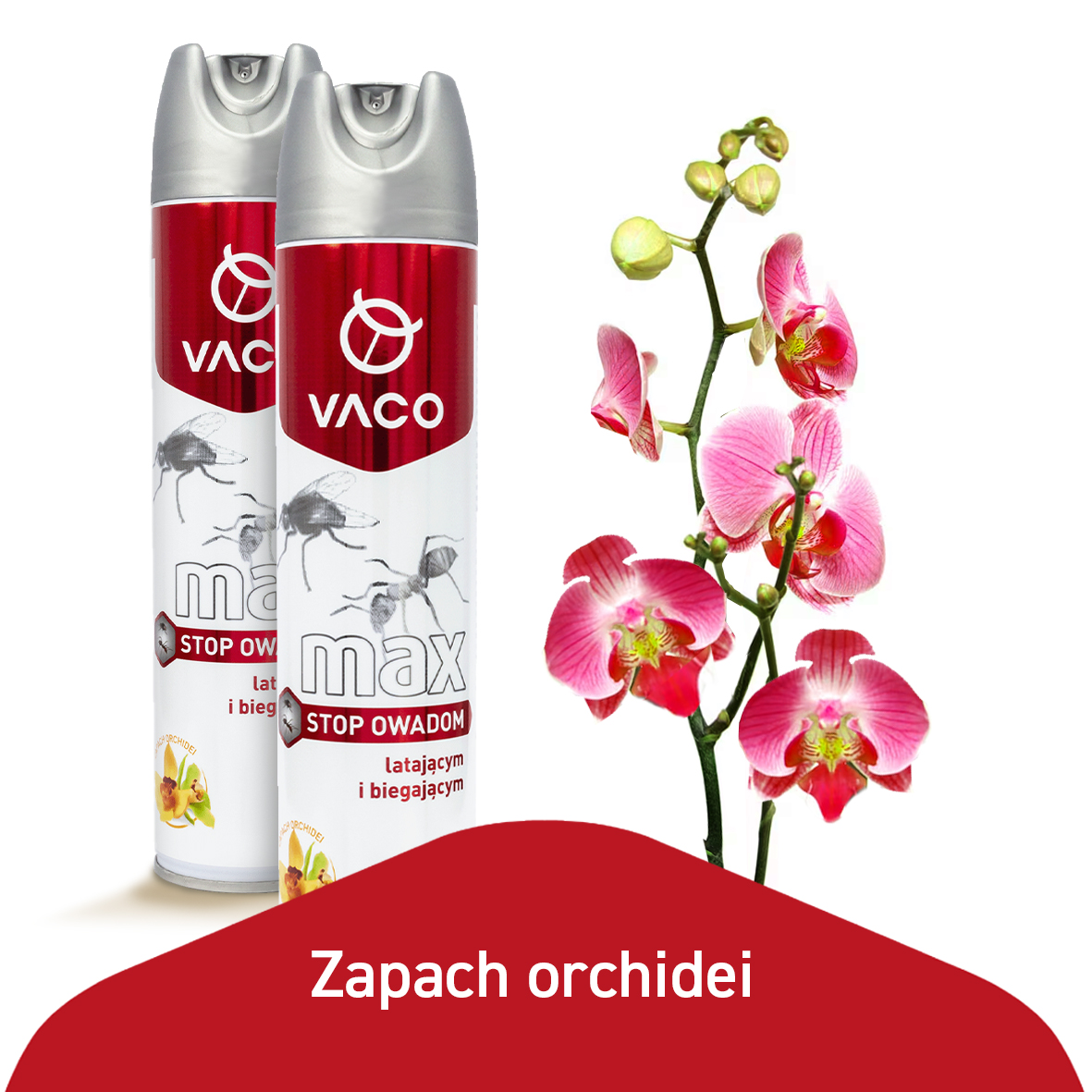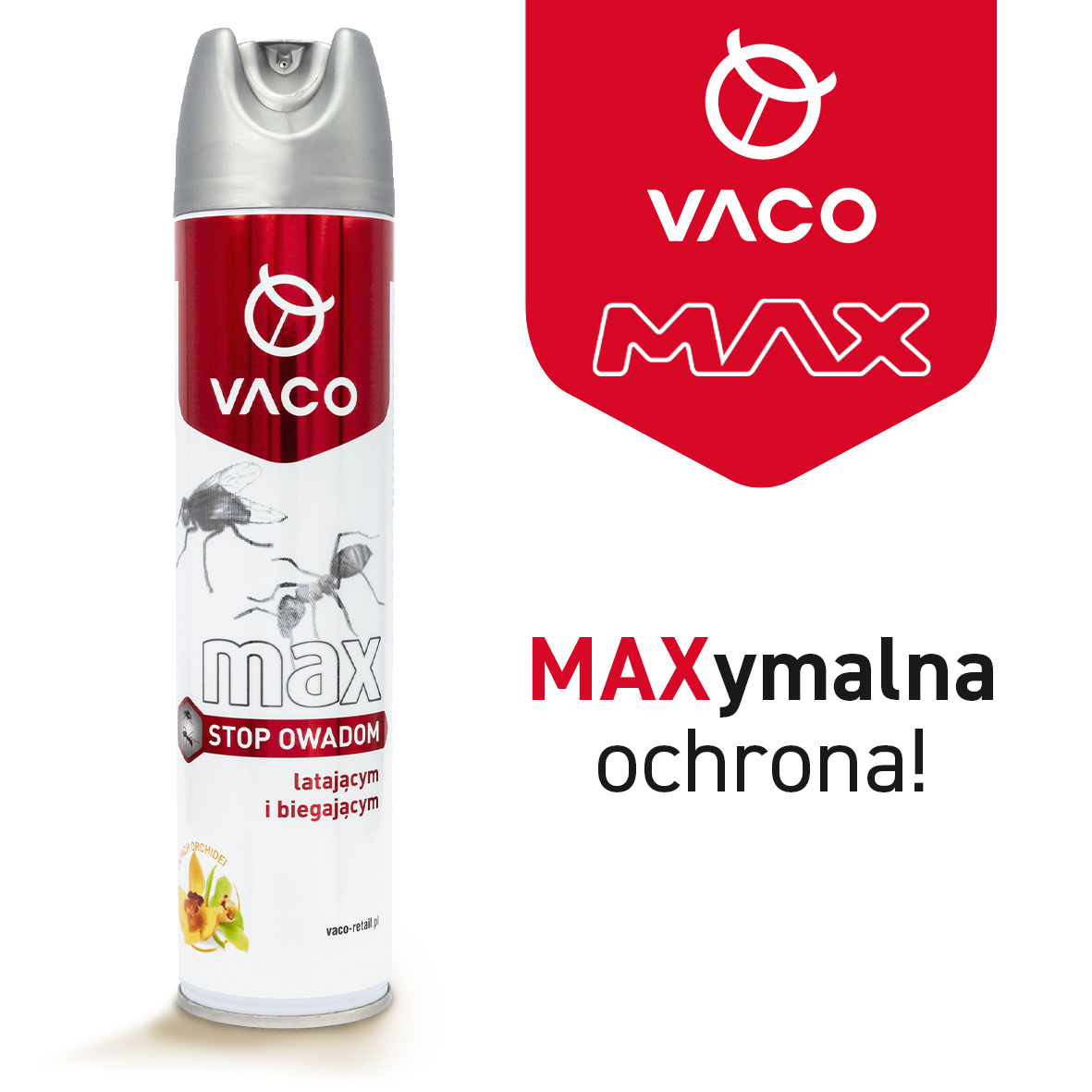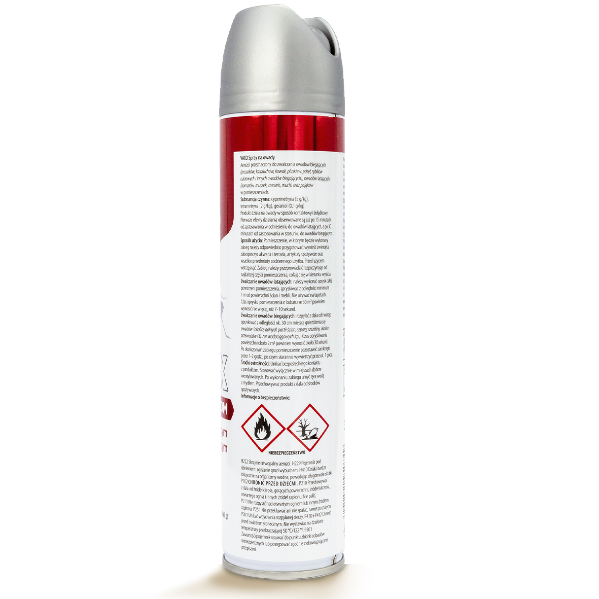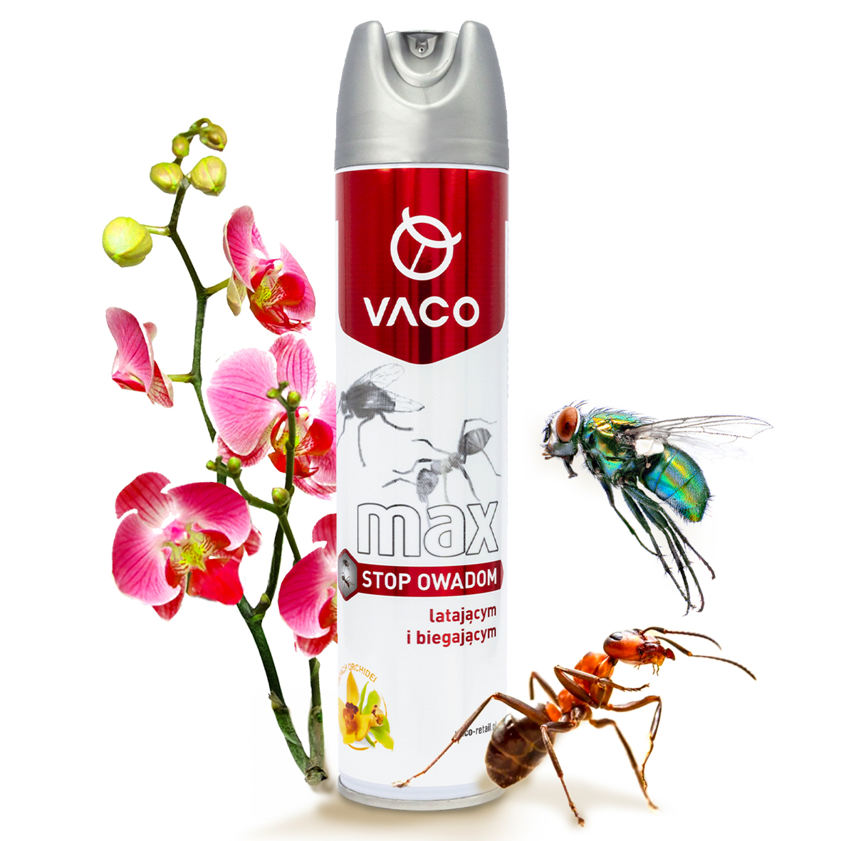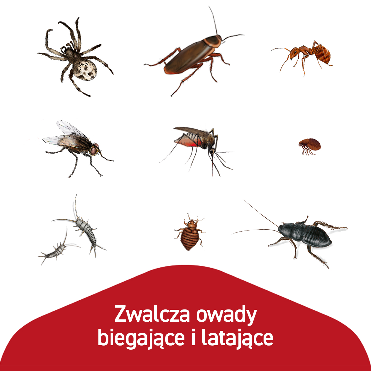 Spray MAX stworzony z myślą o zwalczaniu owadów biegających i latających. Zawarte w produkcie substancje czynne działają w niezwykle szybki i skuteczny sposób. Preparat posiada przyjemny zapach. przyjemny zapach nie pozostawia plam i zacieków pierwsze efekty działania występują po 15 min. od zastosowania SKŁAD PRODUKTU: tetrametryna 2g/kg cypermetryna 5 g/kg  geraniol 0,1 g/kg SPOSÓB UŻYCIA: Pomieszczenie, w którym będzie wykonany zabieg należy odpowiednio przygotować: wynieść zwierzęta, zabezpieczyć akwaria i terraria, artykuły spożywcze oraz wszelkie przedmioty codziennego użytku. Przed użyciem wstrząsnąć. Zabieg należy przeprowadzić rozpoczynając od najdalszej części pomieszczenia, cofając się w kierunku wyjścia. Zwalczanie owadów latających: należy wykonać oprysk całej przestrzeni pomieszczenia, spryskiwać z odległości minimum 1 m od powierzchni ścian i mebli. Nie używać na tapetach. Czas oprysku pomieszczenia o kubaturze 30 m3 powinien wynosić nie więcej, niż 7-10 sekund. Po skończonym zabiegu pomieszczenie pozostawić zamknięte przez 1-2 godz., po czym starannie wywietrzyć przez ok. 1 godz.
